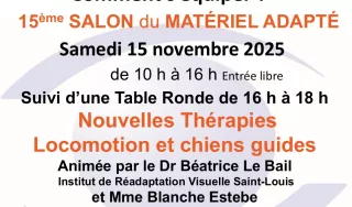 - de 16 h à 18 h, table ronde sur les "Nouvelles Thérapies, Locomotion et chiens guides". Animée par le Dr Béatrice Le Bail, Institut de Réadaptation Visuelle Saint-Louis et Mme Blanche Estebe, Référente des partenariats - Chiens Guides de Paris.