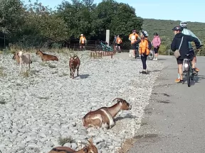 Nous repartons pour les derniers 5km. Philippe et Christophe testent la conduite d’une joëlette. On discute sur le chemin caillouteux. L’ambiance est agréable.